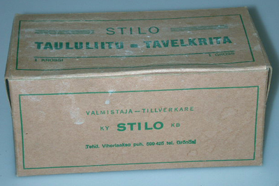 Pahvista valmistettu suorakulmainen laatikko, joka aukeaa päältä. Sen sisällä on kolme liidun palaa. Laatikkoon on vihreällä painettu tuotteen nimi, valmistaja ja valmistuspaikka eli Taululiitu - tavelkrita, 1 krossi, Ky Stilo Kb Tehd. viherlaakso puh. 599 425 tel. Gröndal.