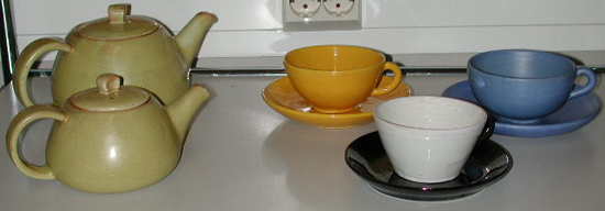 Sininen maljamainen kuppi ja sininen lautanen, jonka keskiosassa on ura kuppia varten.