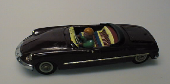 Viininpunainen avoauto , jonka kyljissä on metallinväriset koristelistat kuten myös puskurit ja pölykapselit. Auton takaluukku aukeaa, tuulilasi puuttuu. Autossa istuu vihreä puseroinen kuljettaja. Auton sisältä löytyi paperin kappale, jossa näkyy auto, jonka konepellillä on pokaaleita ja toiselta puolelta pystyy lukemaan osan tekstistä: "Eino... Kaj N... kaksi maamme p... Ajaa Peugeot. Två av vårt lands... Kör Peugeot.
