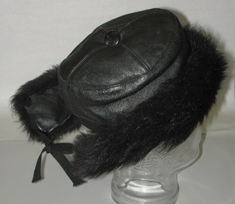 Mustaa nahkaa. Kupu pyöreä, levenee reunaksi, päälaki ommeltu 4 sektorista, keskellä musta nappi. Lierin reuna käännetään ylös. Reunaa kiertää musta, pehmeä, pitkäkarvainen turkis. Takana 7 cm pitkät siivekkeet, joiden päässä puuvillanauhat, leveys 1 cm. Kuvussa takaraivossa yhdyssauma ja alareunassa joustava reunusnauha. Sisäpuolella paksu musta tikkivuori. Niskasaumassa kangaslappu: Fredrikson, Jyväskylä.
