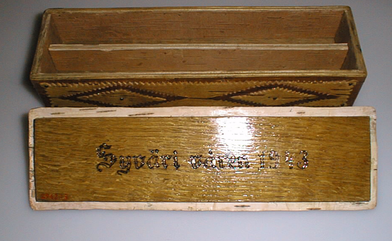 Kapea suorakaide. Kansi päälleasetettava, nupillinen. Laatikossa 2 samankokoista, pituussuuntaista lokeroa välilevyllä, joka sivuja matalampi. Sisäpohja ja sisäkansi tammea, muut sivut päällystetty tuohella. Sivuilla ja kannen päällä koristeena sahalaitainen tuohilevy, kiinnitetty kulmista pienillä nupeilla. Pitkillä sivuilla 2, päädyissä ja kannessa 1 sahalaitainen vinoneliökoriste päällekkäisesti pienenevistä, tummista ja vaaleista vinoneliöistä.Sivuissa 2, päälimmäinen vaalea, kannessa 3, päälimmäinen vaalea,johon nuppi kiinnitetty. Nuppi kapea suorakaide, päältä taitteinen, sivuja koverrettu. Kansi pysyy paikoillaan päälliosaa pienemmällä tammilevyllä, jonka päälle tuohilevykansi liimattu.