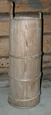 Puuta, kimpityötä. Korkealaitainen kapea kimpiastia, jonka laidat hiukan kapenevat sisäänpäin. Laitoja pitää alhaalta koossa kolme puuvannetta, ylempää vanteet puuttuvat. Ylälaidasta ulkonee matala tappi kantta varten, sekä kädensija, -muotoinen profilointi. Kansi ja mäntä puuttuvat