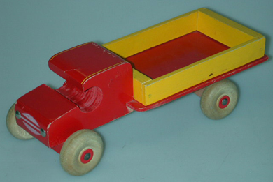 tyylitelty, punaiseksi maalattu puinen kuorma-auto, jossa keltaiseksi maalatut lavan seinät. Pyörät maalaamatonta puuta. Etuosassa kaksi metallinuppia ajovaloina, niiden väliin ruiskumaalattu valkoisella soikea kuvio. Katolla kaksi maalattua keltaista raitaa.