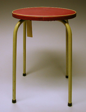 Hyvin yleisesti käytössä ollut jakkara. Jalkoina on neljä ohutta metalliputkea, jotka on päällystetty valkoisella muovilla. Jalkojen alaosassa on mustat muovisuojukset. Jalkoihin ruuvattu pyöreä istuinlevy on vaneria, jonka pehmusteena on luultavasti ohut vaahtomuovi ja verhoiluna punainen keinonahka. Istuimen verhoilun reunan ylälaitaa kiertää valkoinen muoviterenauha.