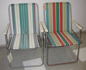 Kokoontaittuva puutarhatuoli, jonka runko on teräsputkea. Istuimen ja selkänojan väliin on pingotettu markiisikangas, jonka värit ovat: valkoinen, sininen, keltainen ja punainen. Markiisikangas on liitetty takana teräsputkeen kolmella jousella ja kankaan sisälle ommeltuun teräskeppiin. Käsinojat ovat terästä, joka on suojattu valkoisella muovilla.