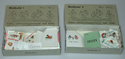Pelimerkkejä on 50 kpl, joita säilytetään sinertävässä, suorakaiteen muotoisessa, kannellisessa laatikossa. Laatikon päällä on kuva pelaavista lapsista. Sen kulmat on kiinnitetty metalliniitein. Pelimerkeissä on kuva, jonka alla sana, josta puuttuu kirjain. Merkin nurjalla puolella punainen viivakuvio. Kuvion tarkoituksena on toistua samanlaisesti kuin pelilaudan taustassa. Pelissä on mukana 50 pelikorttia, joista puuttuu yksi kulma. Kortissa toistuu sama kuva, molemmin puolin ja sama sana, mutta nurjalla puolella on oikea vastaus. Lisäksi on 2 vihreää ja 2 vaaleanpunaista korttia. Pelin nimi on Medljudet 1. Mukana on myös 16 itsetehtyä pelimerkkiä, joihin kirjoitettu sana.