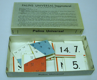Pelimerkkejä on 24 kpl, joita säilytetään sinertävässä, suorakaiteen muotoisessa, kannellisessa laatikossa. Laatikon kannessa on peliohjeet. Sen kulmat on kiinnitetty metalliniitein. Pelimerkeissä on numero 1-24 ja nurjalla puolella sama numero toistuu useampana numerona. Peli on nimeltään Palins Universal-läggmateriel.