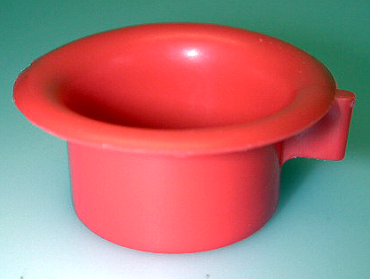 Pieni punainen, suorareunainen potta, jonka yläreuna kääntyy ulospäin ja jossa on pinei levymäinen korva.
