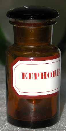 Pyöreä pohja, suorat seinät, pyöristetty hartia. Leveä kaula, jonka suureuna taittuu ulos. Hiottu tulppa, jonka yläpinta kupera. Kyljessä ruskea-valkoinen maalattu kilpi, jossa isoin antiikvakirjaimin: EUPHORB.