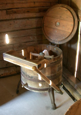 Puuta, rautaa. Puinen (kimpi), katkaistun tynnyrin kaltainen pesusoikko, joka on rautavantein sidottu ja joka seisoo kolmen, melko korkean jalan varassa. Jalat valurautaa, yksinkertainen "tassu"-muoto. Tynnyrin sisään on siipimäisesti kiinnitetty neljästä sorvatusta puusta valmistettu ratas. Sitä liikutellaan edestakaisin tynnyrin alle kiinnitetyllä varsimekanismilla. (pumppumaisesti vartta edestakaisin työntäen ja vetäen.) Tynnyrin alalaidassa puutapilla suljettava likaveden poistoaukko. Tasainen pyöreä kansi, saranoilla; suljetaan säpillä. Kannen kohdalla on tynnyrin laidassa suorakulmainen laajentuma. Ulkolaidassa teksti: WASERSTAND OHNE WÄCHE. ja sen alla nuoli.
