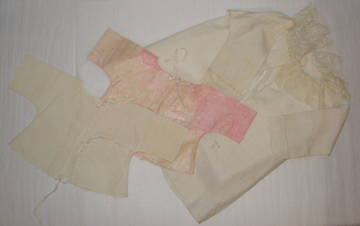 Ohutta palttinaa. Pyöreä pääntie, edessä halkio, jonka kiinnitys kauluksen nauhakujassa kulkevan 2 mm leveän nauhan avulla. Kaulus ohuempaa puuvillaa (?), jossa tambourine-kirjailua, rypytetty. Kauluksen päät pyöristetty, reunoissa tyllipohjaista, kasviaiheista pitsiä. Ei sivusaumoja, hihan alareunassa saumat. Hihan suissa binche-pitsiä ja reikäommel. Nimikointi.
