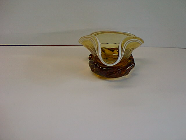 Kolmion muotoinen suurikokoisella jalalla varustettu tuhkakuppi,jonka reunat taivutettu sisäänpäin. Valkoiset luulasista valmistetut nauhat kulkevat suun ympärillä.