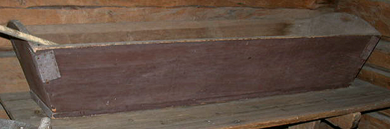 Puuta, maalattu. Pitkulainen taikinan astia. Sivut ulospäin levenevät. Päätysivujen yläreuna kaareva. Sivut liitetty yhteen rautanauloilla, lisäksi peltilevyllä. Sivut maalattu tummiksi ulkoapäin.