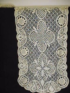 Kapea, pitkä liina, jonka reunaan nyplätty vuorotellen lehti- ja kukka-aiheita. Keskellä lehti- ja neliapilakuvioita (kukka?). Hajonneita kohtia korjattu heiman alkuperäistä poikkeavalla langalla.