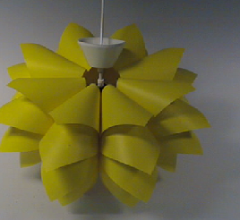 Keltaisesta ohuesta muovista valmistettu varjostin, joka muistuttaa kerrottua , alaspäin aukeavaa kukkaa. "Terälehtikerroksia" 5, yhdistetty sisäpuolella muovisella renkaalla. Renkaan varassa metallinen rengas, jonka sisällä kulkee johto ja polttimonkanta. Johdon päässä muovikupu ja sokeripala.