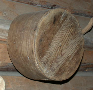 Puinen. Pyöreäpohjainen, suoralaitainen puuastia. Kanneton. Laidan sauma ommeltu puujuurella. Laidat kiinnitetty pohjaan puunauloin.