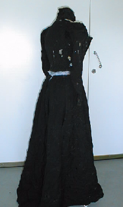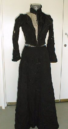 Jakku. Tyköistuva, vuoritettu musta, pitkähihainen jakku. Musta pystykaulus on satiinipintaista puuvillaa. Seitsemän tukea eli "luuta" ommeltuna vuorikankaaseen. Vyötärönauhassa hakaset hameen kiinnittämistä varten. Jakku kiinnittyy edestä hakasin. Edustasta puuttuu oikealta puolelta koristelaskostus, vasen paikallaan. Runsaasti tuhohyönteisvaurioita (reikiä).Hame. Viistotetuista paloista (6 kpl) ommeltu pitkä, vuoritettu hame. Helmassa ns harjasnauha. Avautuu takaa hakasten avulla. takana sumaan upotettu tasku. Vuoritettu tiiviillä mustalla puuvillakankaalla. Vyötäröllä takaosassa jakkuun sopivat lehtiäiset. Runsaasti hyönteisvaurioita (reikiä).