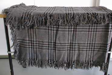 neliön muotoinen iso huivi, jonka jokaisessa sivussa solmiamattomat hapsut. Sidos toimikasta. Pohjaväri harmaa, jolla mustan ja vaaleamman harmaan sävyisiä raidoista muodostuvia ruutuja.