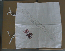 Suorakaiteen muotoinen tyynyliina, jonka toisessa pitkässä sivussa kahden parin nauhakiinnitys. Päällipuolelle ommeltu keskelle vinosti nurkasta nurkaan ulottuva valipitsi.Yhdessä nurkassa ristipitoin kirjottu NM(Naima Malmström)
