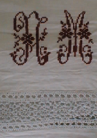 päällyslakana, jonka yläreunassa on valkoisella puuvillalangalla virkattu pitsi ja punaisella puuvillalangalla monogarmmikirjailu AM.