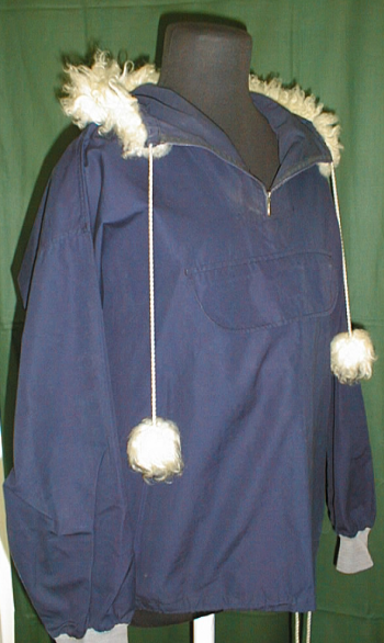 käsin ommeltu hupullinen anorakki, jonka etukappaleessa on upotettu läppätasku. Hupun reunaan on ommeltu kaitale lammasturkista ja nauhakuja, johon on pujotettu kierretty puuvillanyöri. Nyörin päässä on turkistupsut.Hihansuissa harmaat joustimet, pääntien etuhalkio on vetoketjullinen.