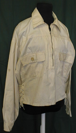 luonnonvalkoinen miesten kauluksellinen anorakki, jossa pääntiellä vetoketjukiinnitys ja edessä molemmin puolin laskokselliset läpälliset (nappi) paikkataskut. Sivuissa molemmin puolin pareittain vastakkain sirkat, joiden kautta nyöreillä voitiin takkiä kiristää tai löysentää.Rannekkeissa, joihin ommeltu laskostetut hihat, nappi ja napinläpi, olkaakarrokkeet.