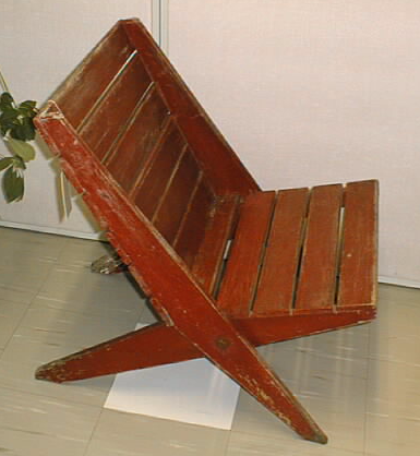 Kokoontaitettava X-jalkainen puutarhatuoli. Koottu leveähköistä rimoista, jalat ja matalan selkänojan sivulaudat kapenevat päitä kohti.