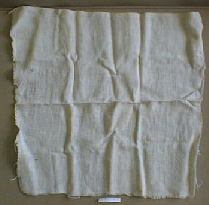 Epäsymmetrisesti valkoisen kankaan reunasta leikattu neliömäinen tilkku.