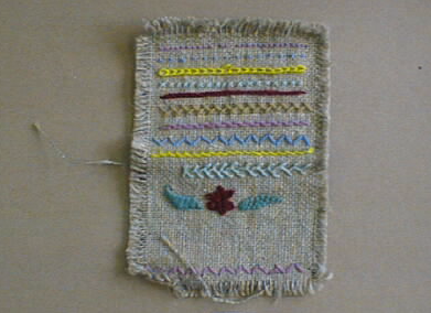 Ruskealle rohdinpellavakankaalle kirjailtu punainen kukka vihrein lehdin sekä erivärisiä kirjontatekniikkamalleja.