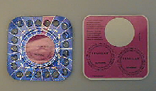 Neliön muotoinen hopeanvärinen muovista ja foliosta kerrostettu levy, jossa lokoset 21 lääketabletille. Takapuolella lääkkeiden kohdalla numerointi. Keskellä vaaleanpunainen tarra, jossa viikonpäivät.
