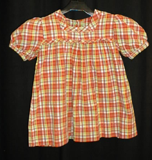 n. 2-3 vuotiaan tytän mekko, jossa pienet lyhyet pomutetut hihat. Pääntiellä takana napitushalkio. Edessä ja takana kaarroke, johon alaosa on ommeltu kiinni. Kulmikas pääntie on huoliteltu samasta kankaasta valmistetulla vinokaitaleella.Hameen nurjalle puolelle on musteella kirjoitettu kirjaimet VK.B