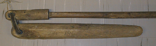 Pitkä pyöreä varsi havupuuta, sen päässä holkki, johon liitetty teräosa nahkalenkillä. Holkki ja terä tammea. Holkissa peltivahvistus ja toinen, pieni läpimenevä reikä. Nahkalenkkiä vahvistettu rautalangalla. Terässä kaiverrus "år 1865".