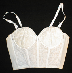 Naisten rintaliivit, joista olkaimet voidaan irroittaa. Takana 6 hakasen kiinnitys. Etuosa tyllipitsikankaasta. Liiveissä on pystykea (metallia) ja kaarituet.