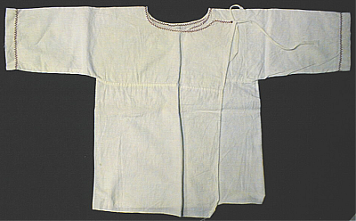 edestä toiselta sivulta kokonaan avautuva paita, yläreunassa pääntiellä nauhakiinnitys. Pitkien hihojen hihansuussa punainen siksakommel samoin kuin pääntiellä.