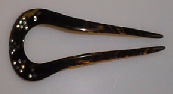 Litteässä ruskeankirjavassa neulassa on kaksi kärkeä, muutoin taipuu pitkänomaisena lenkkinä, jonka levennettyyn päähän on istutettu pieniä viistehiottuja lasikiviä. Lasit kolmion muotoisissa ryhmissä, väleissä maalattuja täpliä.