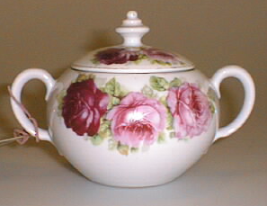 Koristeellinen, kahdella voimakkaasti ulkonevalla kädensijalla varustettu sokerikko.Ruusuaiheiset siirtokuvat, jotka ryhmittyvät kolmen ruusun kokonaisuuksiin sokerikon vastakkaisille kyljille. Kannessa kaksi kahden ruusun ryhmää.
