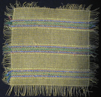 paperilangasta kudottu harva palttinasidoksellinen kangaspala, johon on pujoteltu kolme raitaryhmää eri värisiä villalankoja. Reunoihin jätetty hapsut paperilangasta, jonka purkautuminen on estetty reunaan käsin ommellulla langalla.