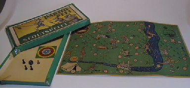 Suorakaition muotoinen matala laatikko, jonka kannessa värikuva neljästä partiopojasta. Sisällä kolmeksi taittuva pahvinen pelilauta, jossa väripainettuna joki, partiolaisia, numeroita ym. Erilliseen pieneen pahvilevyyn on kiinnitetty alumiininen nuoli, joka pyörii nastan varassa, painettuihin sektoreihin merkitty numeroita. 4 kpl puisia sorvattuja eri värisiä nappuloita sekä puinen noppa. Säännöt painettu kannen sisäpuolelle.