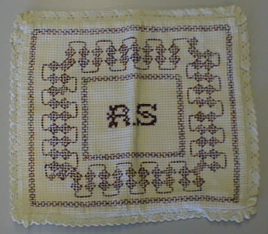 Valkoinen suorakaition muotoinen pieni liina vohvelikangasta. Geometrinen pujotuskoristelu punaisella, keskellä ristipistoin RS. Reunassa teollista brodyyriä, alapinta valkoista flanellia, joka kaksinkertainen, toimii lämpötoppauksena.