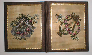 Kovat kirjankannet ruskeata kloottipäällysteistä pahvia. Kummallakin puolella perforoitu pahvi, jolle ommeltu lasi- ja metallihelmistä kuviot: etupuolella lyyra ja ruusuja, takapuolella kyyhkyjä ja kukkia. Kehyksenä kullanvärinen nauha. Sisäpuoli valkoista, moireepintaista paperia, keskellä sininen kangasliuska.