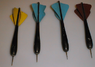 Varsi mustaksi maalattua sorvattua puuta. Kapea takapää lohkottu neljäksi, rakoihin on työnnetty punaisesta selluloidilevystä valmistetyt sulat. Messinkinuppi topparina lohkotussa päässä. Varren painona lyijyä, joka on pistetty sisään paksun pään kyjissä olevista reijistä.