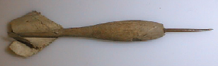 Tikan varsi sorvattua puuta, terä rautaa. Varsi suippenee päätä kohti, suippo osa on lohkottu neliosaiseksi, rakoihin on kiinnitetty kyllästetystä kankaasta valmistetut sulat. Teräpuolen paksussa päässä näkyy pyöreät reijät, jotka on täytetty lyijyllä.