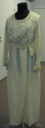 Pitkähihainen pitkä hame, jossa pyöreä pääntie. Koristeena kapea kankaaseen polveilevasti ommeltu nauha. Koristeet pääntiellä, hihansuissa ja edessä boleromaisessa yläosassa, joka jatkuu taakse vyötnä. Kohottettu vyötärösauma.Yläosa huoliteltu hihattomalla vuoriosalla, jossa pitsisomisteet pääntiellä ja hihansuissa.