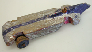 Yhdestä kappaleesta, valmistettu hopeanvärinen, kilpa-automallinen puuauto. Auton peräosassa on "vauhtisiiveke", joka on auton runkoa korkeampi ja pidempi. Auton keskiosa on maalattu siniseksi. Pyörien välinen akseli on tehty naulasta, joka on ruostunut ja akselia urassaan pitää nasta. Pyörät on myös puusta ja maalattu siniseksi. Takapyörät puuttuvat kokonaan.