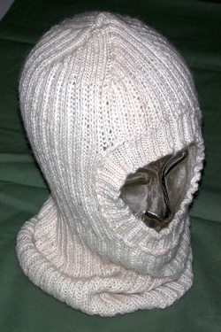 Joustinneulehuppu, 2o, 2n neuletta. Kasvojen kohdalle neulottu 2,5 cm joustin. Takaosassa reunassa 6 cm pitkä halkio.