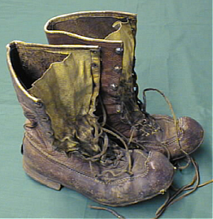 Pitkävartiset, nahkanauhoin suljettavat jalkineet, ns pieksut. Kärjet voimmakkaasti ylös kaartuvat. Pohja kiinnitetty alunperin puunauloilla. Myöhemmin puolipohjattu kumilla ja kiinnitetty metallisilla nauloilla. Nauhat kulkevat metallisten sirkkaparien läpi (5 kpl)ja tämän jälkeen ylempänä hakasparien (4kpl) kautta.