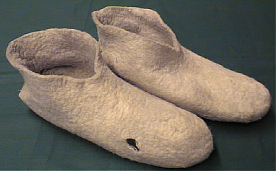 Pari lyhytvartisia valkoisia huovutettuja villaisia sukkia. Suuret kulumareiät kantapäässä. Pienemmät pohjassa ja "vaivaisenluun" kohdalla.