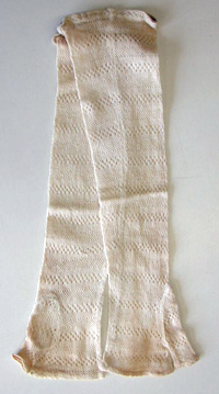 Pitkävartiset naistenpuolikäsineet, jotka on neulottu raidallisena toistuvin pitsikuvioin. Varren suuaukolle on ommeltu myöhemmin käsin kuminauha, joka on menettänyt elastisuutensa. Sauma käsineen ulkoreunassa.