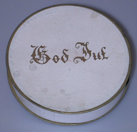 Valkoinen, pyöreä pakkaus, jossa kansi. Pohjakappaleen alareuna ja kannen yläreuna ovat ulkonevat ja kullanvärisiä. Rasian sisällä on silkkipaperit; kansikappaleessa samankokoinen ja pohjakappaleessa nousee myös reunoille. Rasian sisällä on myös itsetehty valkoisesta piipputrassista nelijalkainen eläin, jolla on häntä. Kannessa kultaisella kirjoitettu teksti: God Jul.
