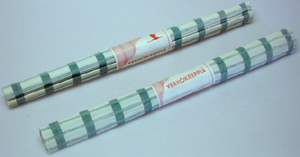 Rullalla oleva kreppiverho, jossa on vihreitä raitoja sekä pysty- että vaakasuorassa pohjan ollessa valkoinen. Rullan ympäri on leveä paperilenkki, jossa punaisella teksti: VERHOKREPPIÄ RAF. HAARLA OY TAMPERE ja kuva [verho ja lentävä pitkäkaulainen ja jalkainen lintu, todennäköisesti kurki.] Verhot ovat käyttämättömät.